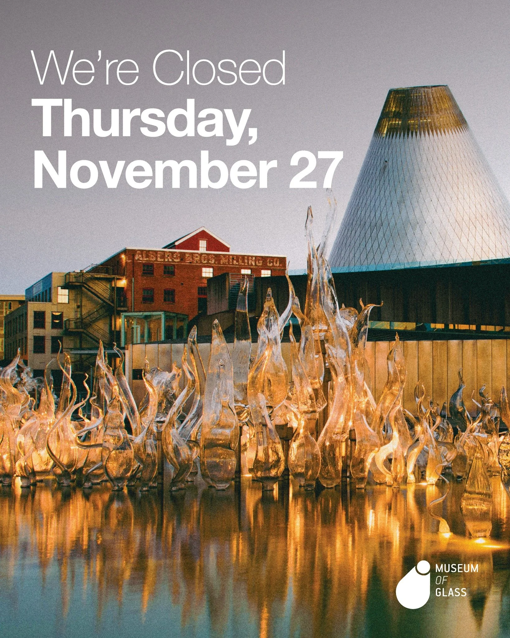 Museum of Glass will be closed on Thanksgiving, November 27. The Museum will be open all day on Wednesday, November 26, and open with normal hours November 28-30.