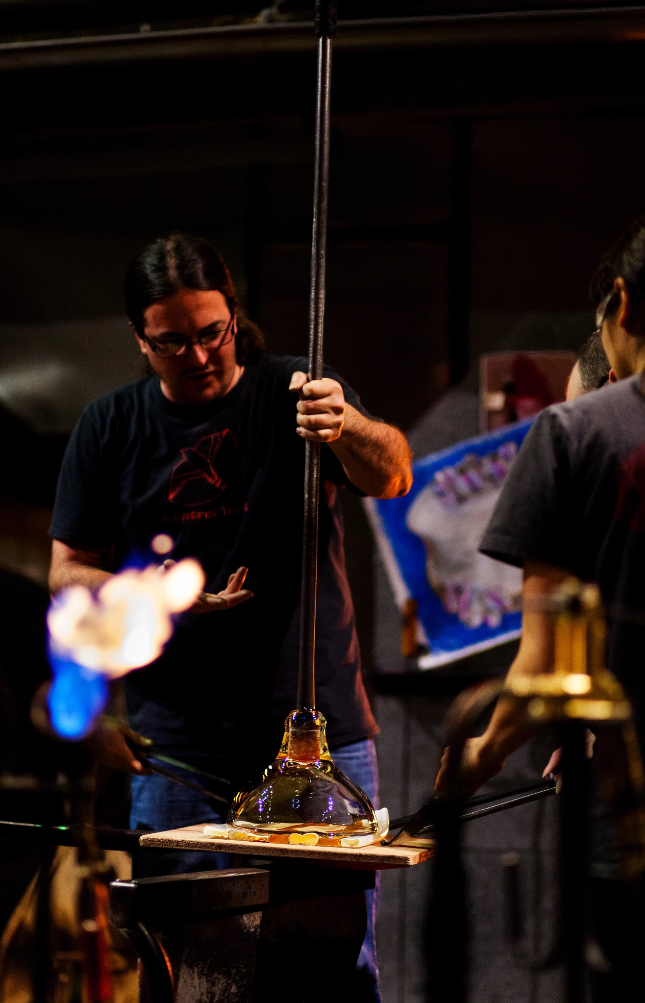 Hot Shop Team member Sarah Gilbert transfers the piece from the bench, where the artists are working, to the gloryhole for it to be heated back up to above 900 degrees Fahrenheit. This is important to keep the glass from cooling too quickly and cracking.